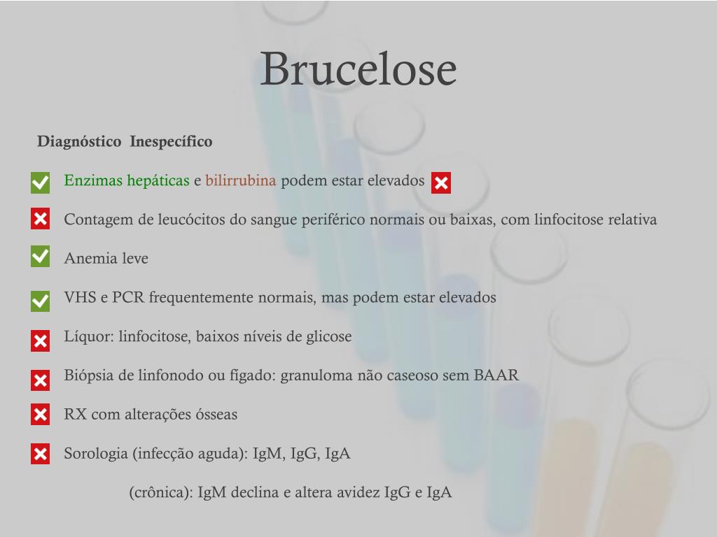 Brucelose Diagnóstico Inespecífico • Enzimas hepáticas e bilirrubina podem estar elevados • Contagem de leucócitos do sangue periférico normais ou baixas, com linfocitose relativa • Anemia leve • VHS e PCR frequentemente normais, mas podem estar elevados • Líquor: linfocitose, baixos níveis de glicose • Biópsia de linfonodo ou fígado: granuloma não caseoso sem BAAR • RX com alterações ósseas • Sorologia (infecção aguda): IgM, IgG, IgA (crônica): IgM declina e altera avidez IgG e IgA