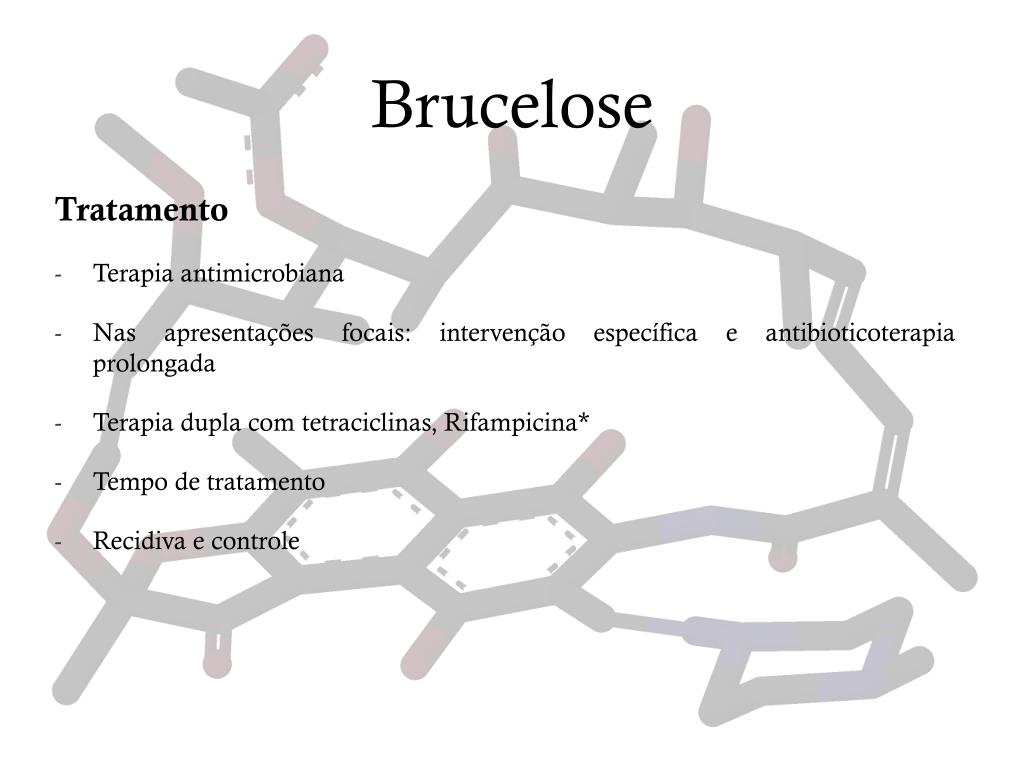 Brucelose Tratamento • Terapia antimicrobiana • Nas apresentações focais: intervenção específica e antibioticoterapia prolongada • Terapia dupla com tetraciclinas, Rifampicina* • Tempo de tratamento • Recidiva e controle