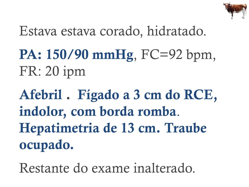 Estava estava corado, hidratado. PA: 150/90 mmHg, FC=92 bpm, FR: 20 ipm Afebril. Fígado a 3 cm do RCE, indolor, com borda romba. Hepatimetria de 13 cm. Traubeocupado. Restante do exame inalterado.