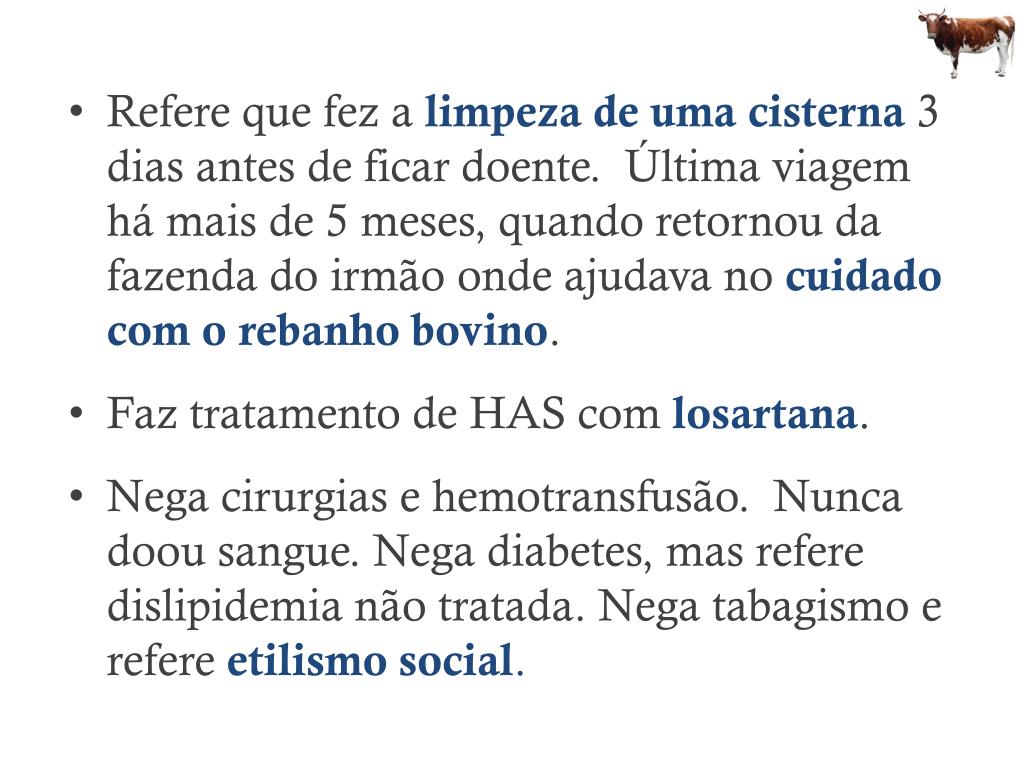 Refere que fez a limpeza de uma cisterna 3 dias antes de ficar doente. Última viagem há mais de 5 meses, quando retornou da fazenda do irmão onde ajudava no cuidado com o rebanho bovino. • Faz tratamento de HAS com losartana. • Nega cirurgias e hemotransfusão. Nunca doou sangue. Nega diabetes, mas refere dislipidemia não tratada. Nega tabagismo e refere etilismo social.