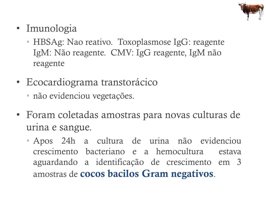 Imunologia • HBSAg: Nao reativo. Toxoplasmose IgG: reagente IgM: Não reagente. CMV: IgG reagente, IgM não reagente • Ecocardiogramatranstorácico • não evidenciou vegetações. • Foram coletadas amostras para novas culturas de urina e sangue. • Apos 24h a cultura de urina não evidenciou crescimento bacteriano e a hemocultura estava aguardando a identificação de crescimento em 3 amostras de cocos bacilos Gram negativos.