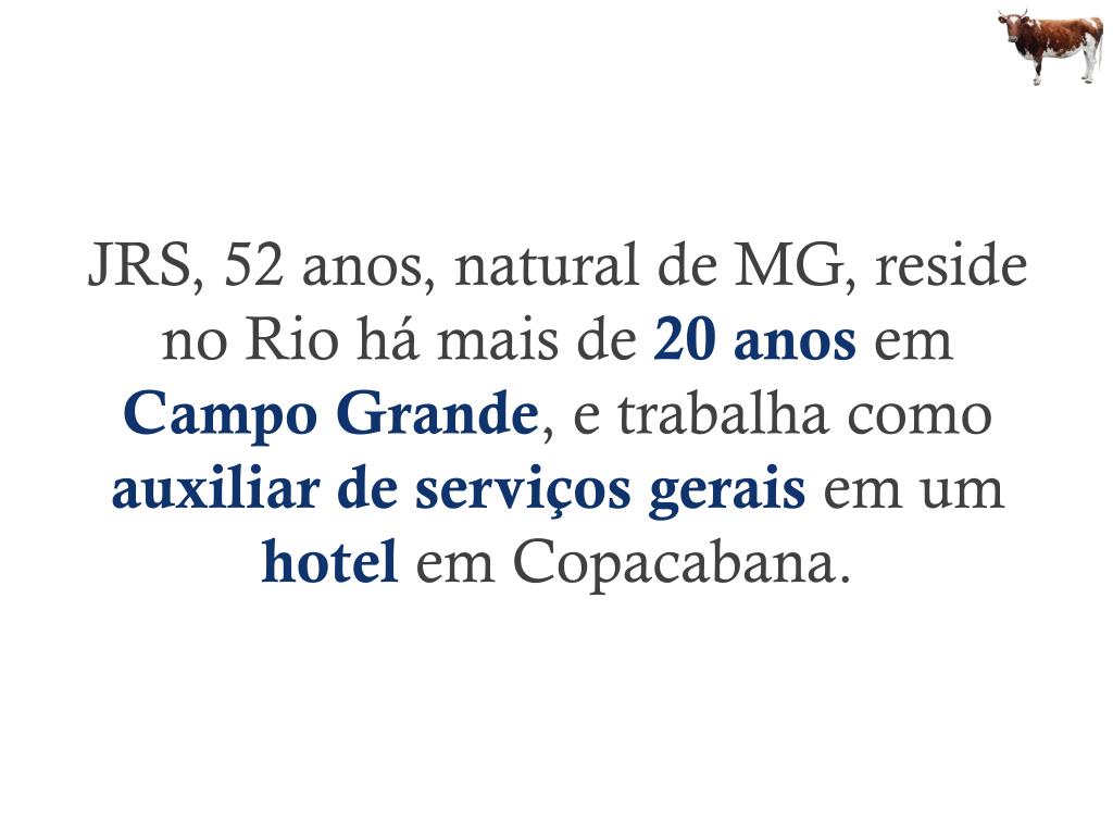 JRS, 52 anos, natural de MG, reside no Rio há mais de 20 anos em Campo Grande, e trabalha como auxiliar de serviços geraisem um hotelem Copacabana.