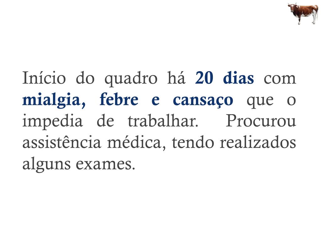 Início do quadro há 20 dias com mialgia, febre e cansaço que o impedia de trabalhar. Procurou assistência médica, tendo realizados alguns exames.