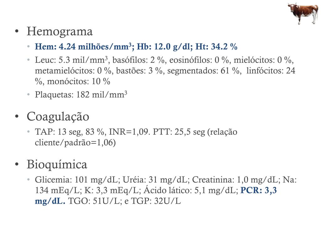 Hemograma • Hem: 4.54 milhões/mm3. Hb: 12.3 g/dl. Ht: 37,9 %. • Leucócitos: 7,6 mil/mm3, basófilos: 0 %, eosinófilos: 1 %, mielócitos: 0 % , metamielócitos: 0 %, bastões: 2 %, segmentados: 56 %, linfócitos: 30 %, monócitos: 1 %. • Plaquetas: 199 mil/mm3. VHS: 34 mm/h. • Coagulação • TAP: 11,9 seg, 83 %. INR = 1,08. • Bioquímica • TGO: 271 U/L, TGP: 35 U/L. PT: 7,1g/dL. Fosfatase Alcalina: 112U/L. Gama GT: 132 U/L. PCR: 4,39. Uréia: 35 mg/dL, Creatinina: 1,05vmg/dL, Na: 139mEq/L, K: 4,2 mEq/L.