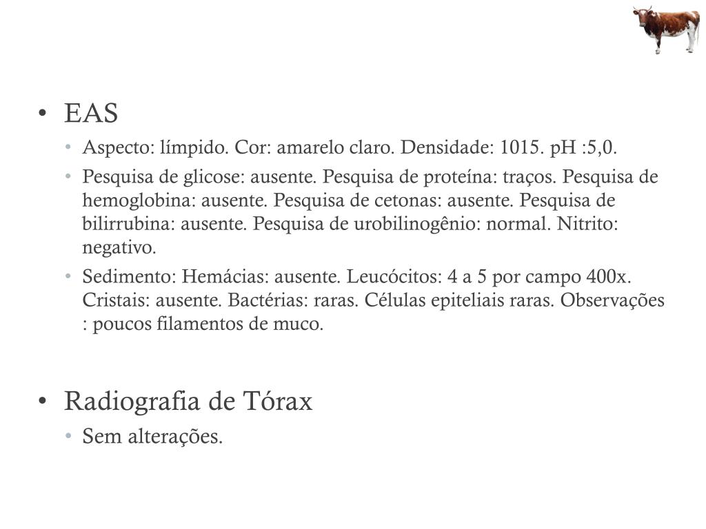 EAS • Aspecto: límpido. Cor: amarelo claro. Densidade: 1015. pH :5,0. • Pesquisa de glicose: ausente. Pesquisa de proteína: traços. Pesquisa de hemoglobina: ausente. Pesquisa de cetonas: ausente. Pesquisa de bilirrubina: ausente. Pesquisa de urobilinogênio: normal. Nitrito: negativo. • Sedimento: Hemácias: ausente. Leucócitos: 4 a 5 por campo 400x. Cristais: ausente. Bactérias: raras. Células epiteliais raras. Observações : poucos filamentos de muco. • Radiografia de Tórax • Sem alterações.