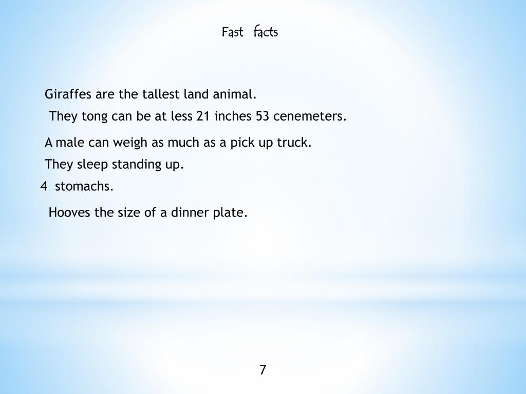 Fast facts Giraffes are the tallest land animal. They tong can be at less 21 inches 53 cenemeters. A male can weigh as much as a pick up truck. They sleep standing up. 4 stomachs. Hooves the size of a dinner plate. 7