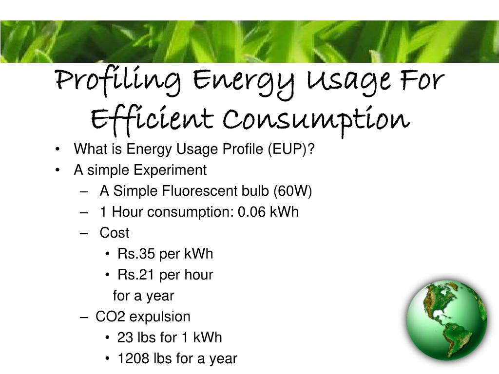 Profiling Energy Usage For Efficient Consumption • What is Energy Usage Profile (EUP)? • A simple Experiment • A Simple Fluorescent bulb (60W) • 1 Hour consumption: 0.06 kWh • Cost • Rs.35 per kWh • Rs.21 per hour for a year • CO2 expulsion • 23 lbs for 1 kWh • 1208 lbs for a year