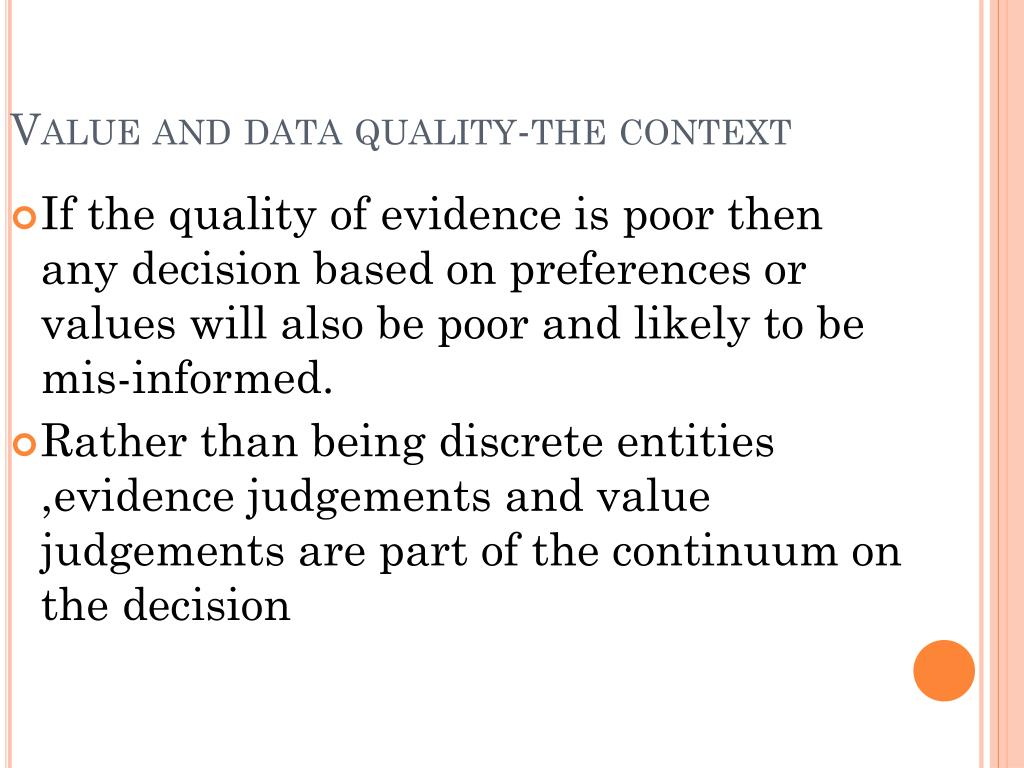 Value and data quality-the context If the quality of evidence is poor then any decision based on preferences or values will also be poor and likely to be mis-informed. Rather than being discrete entities ,evidence judgements and value judgements are part of the continuum on the decision
