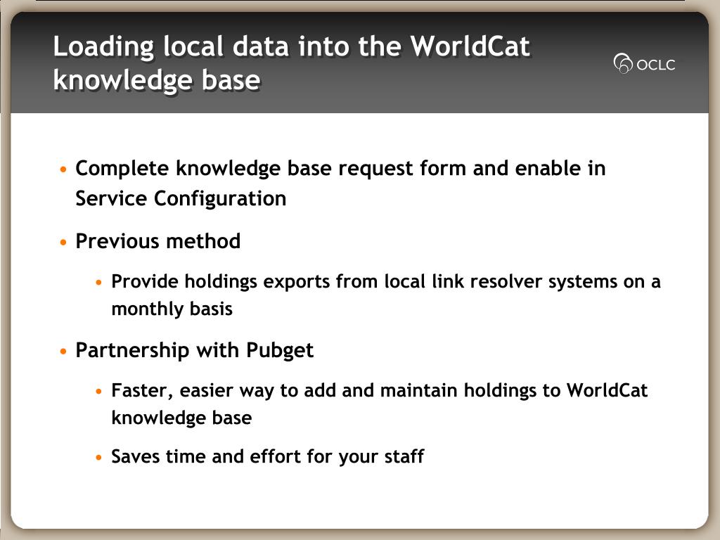 Loading local data into the WorldCat knowledge base • Complete knowledge base request form and enable in Service Configuration • Previous method • Provide holdings exports from local link resolver systems on a monthly basis • Partnership with Pubget • Faster, easier way to add and maintain holdings to WorldCat knowledge base • Saves time and effort for your staff