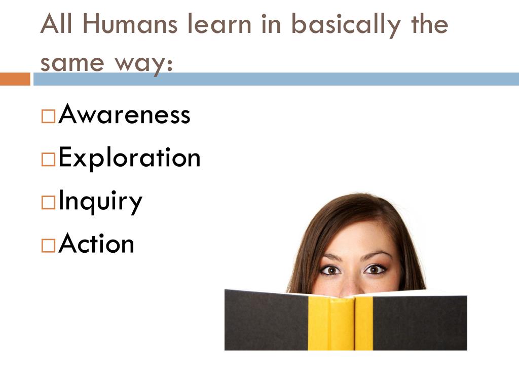 All Humans learn in basically the same way: • Awareness • Exploration • Inquiry • Action