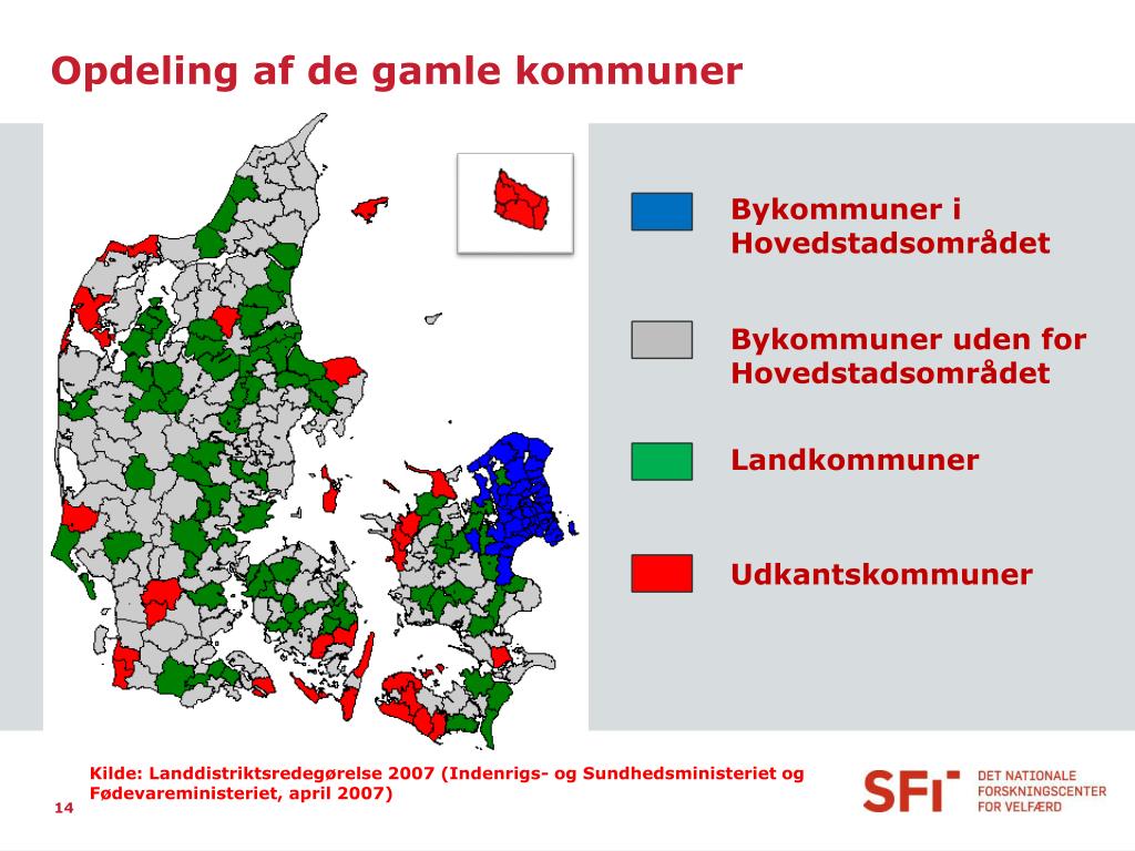 Opdeling af de gamle kommuner Bykommuner i Hovedstadsområdet Bykommuner uden for Hovedstadsområdet Landkommuner Udkantskommuner Kilde: Landdistriktsredegørelse 2007 (Indenrigs- og Sundhedsministeriet og Fødevareministeriet, april 2007)