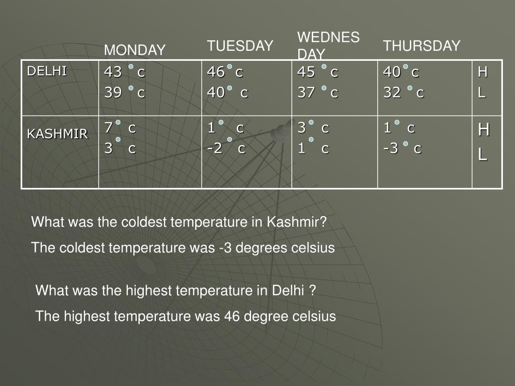 WEDNESDAY TUESDAY THURSDAY MONDAY What was the coldest temperature in Kashmir? The coldest temperature was -3 degrees celsius What was the highest temperature in Delhi ? The highest temperature was 46 degree celsius