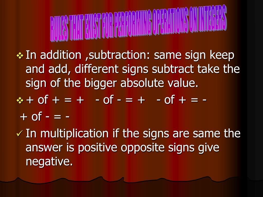 RULES THAT EXIST FOR PERFORMING OPERATIONS ON INTEGERS • In addition ,subtraction: same sign keep and add, different signs subtract take the sign of the bigger absolute value. • + of + = + - of - = + - of + = - + of - = - • In multiplication if the signs are same the answer is positive opposite signs give negative.