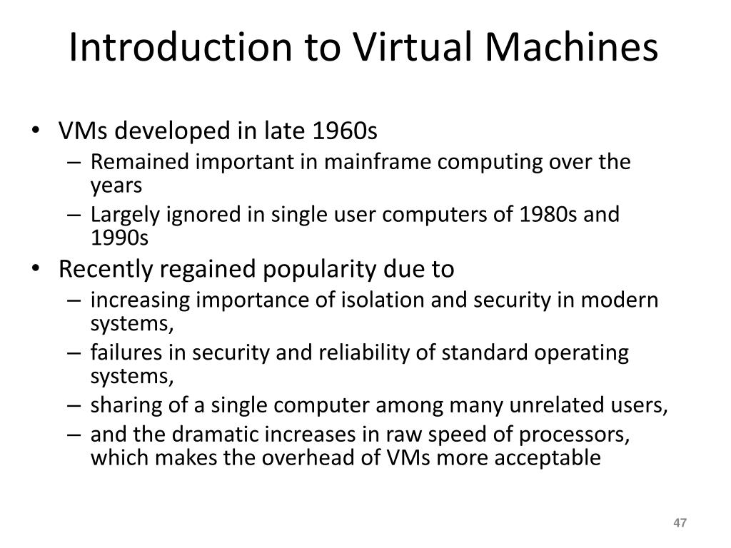 Introduction to Virtual Machines • VMs developed in late 1960s • Remained important in mainframe computing over the years • Largely ignored in single user computers of 1980s and 1990s • Recently regained popularity due to • increasing importance of isolation and security in modern systems, • failures in security and reliability of standard operating systems, • sharing of a single computer among many unrelated users, • and the dramatic increases in raw speed of processors, which makes the overhead of VMs more acceptable