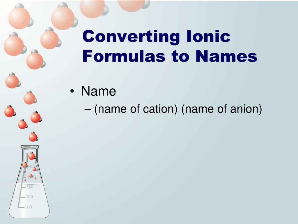 Converting Ionic Formulas to Names • Name • (name of cation) (name of anion)