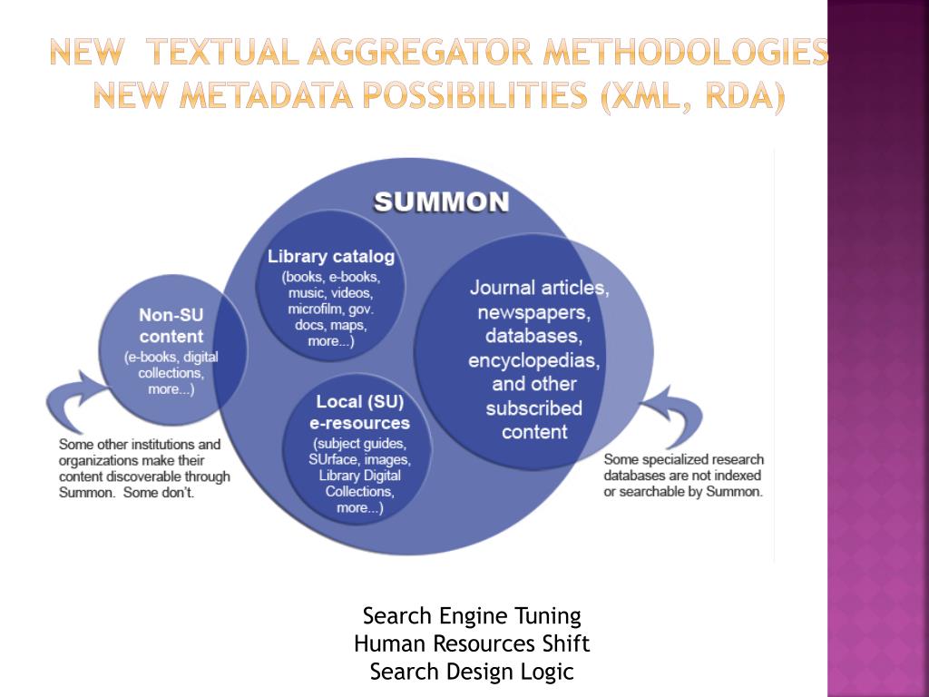 New TeXtual Aggregator MethodologiesNew METADATA POSsibilities (XML, RDA) Search Engine TuningHuman Resources Shift Search Design Logic