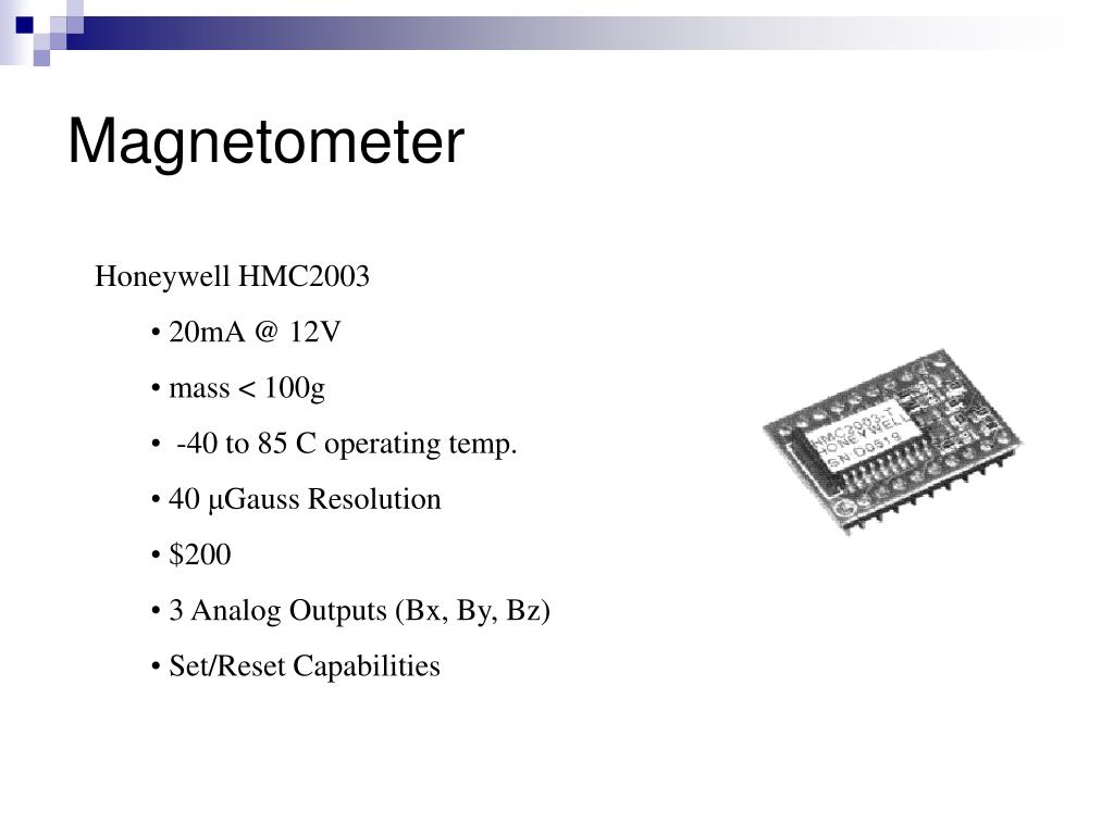 Magnetometer • Honeywell HMC2003 • 20mA @ 12V • mass < 100g • -40 to 85 C operating temp. • 40 μGauss Resolution • $200 • 3 Analog Outputs (Bx, By, Bz) • Set/Reset Capabilities