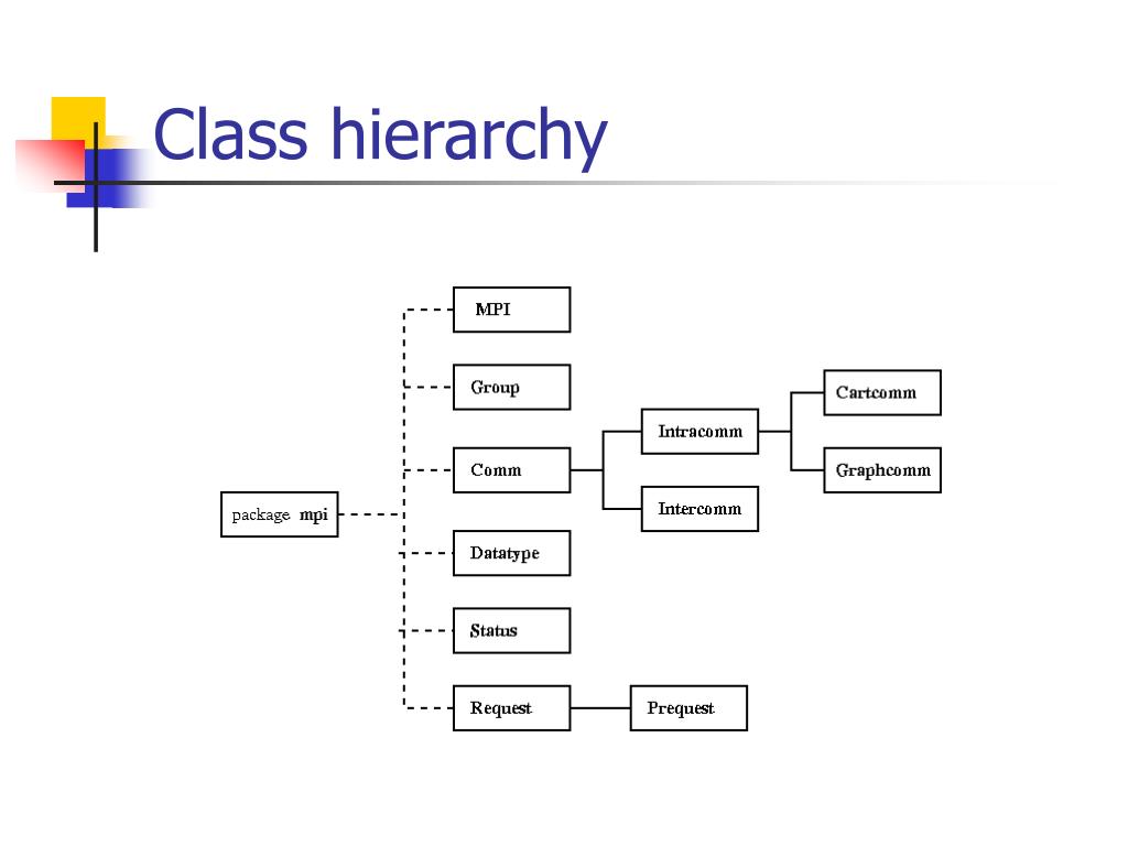 mpiJava features. • Fully featured Java interface to MPI 1.1 • Object-oriented API based on MPI 2 standard C++ interface • Initial implementation through JNI to native MPI • Comprehensive test suite translated from IBM MPI suite