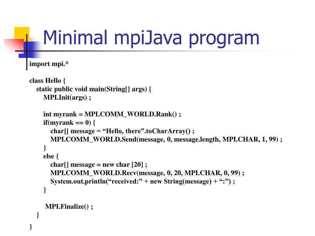 Minimal mpiJava program import mpi.* class Hello { static public void main(String[] args) { MPI.Init(args) ; int myrank = MPI.COMM_WORLD.Rank() ; if(myrank == 0) { char[] message = “Hello, there”.toCharArray() ; MPI.COMM_WORLD.Send(message, 0, message.length, MPI.CHAR, 1, 99) ; } else { char[] message = new char [20] ; MPI.COMM_WORLD.Recv(message, 0, 20, MPI.CHAR, 0, 99) ; System.out.println(“received:” + new String(message) + “:”) ; } MPI.Finalize() ; } }