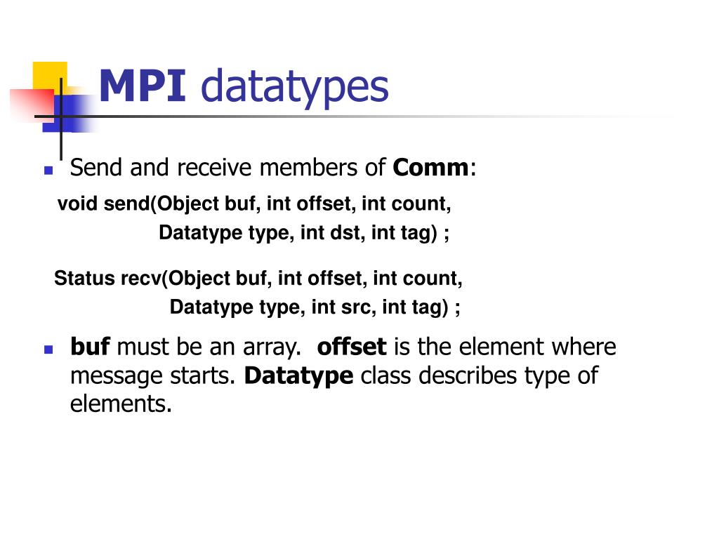 MPI datatypes • Send and receive members of Comm: void send(Object buf, int offset, int count, Datatype type, int dst, int tag) ; Status recv(Object buf, int offset, int count, Datatype type, int src, int tag) ; • buf must be an array. offset is the element where message starts. Datatype class describes type of elements.