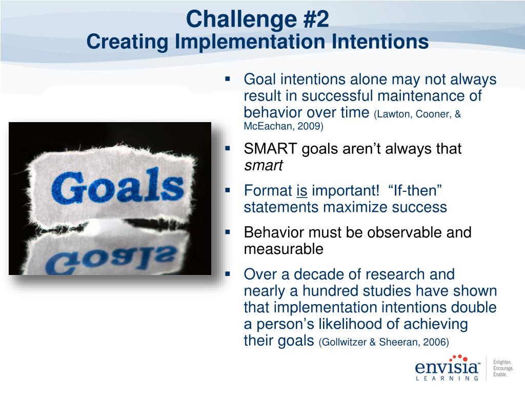 Challenge #2Creating Implementation Intentions • Goal intentions alone may not always result in successful maintenance of behavior over time (Lawton, Cooner, & McEachan, 2009) • SMART goals aren’t always that smart • Format is important! “If-then” statements maximize success • Behavior must be observable and measurable • Over a decade of research and nearly a hundred studies have shown that implementation intentions double a person’s likelihood of achieving their goals (Gollwitzer & Sheeran, 2006)