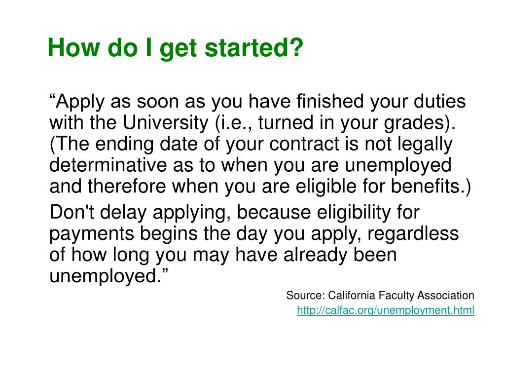How do I get started? “Apply as soon as you have finished your duties with the University (i.e., turned in your grades). (The ending date of your contract is not legally determinative as to when you are unemployed and therefore when you are eligible for benefits.) Don't delay applying, because eligibility for payments begins the day you apply, regardless of how long you may have already been unemployed.” Source: California Faculty Association http://calfac.org/unemployment.html