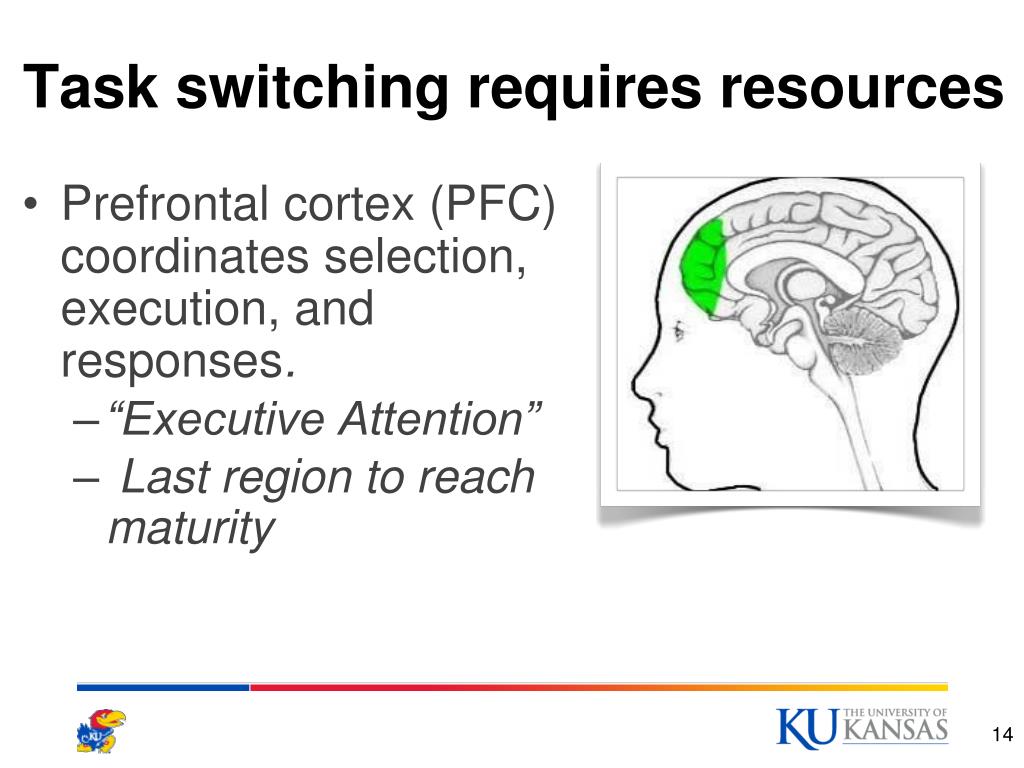 Task switching requires resources • Prefrontal cortex (PFC) coordinates selection, execution, and responses. • “Executive Attention” • Last region to reach maturity