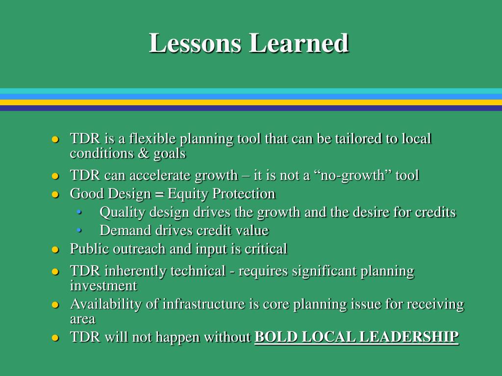 Lessons Learned • TDR is a flexible planning tool that can be tailored to local conditions & goals • TDR can accelerate growth – it is not a “no-growth” tool • Good Design = Equity Protection • Quality design drives the growth and the desire for credits • Demand drives credit value • Public outreach and input is critical • TDR inherently technical - requires significant planning investment • Availability of infrastructure is core planning issue for receiving area • TDR will not happen without BOLD LOCAL LEADERSHIP