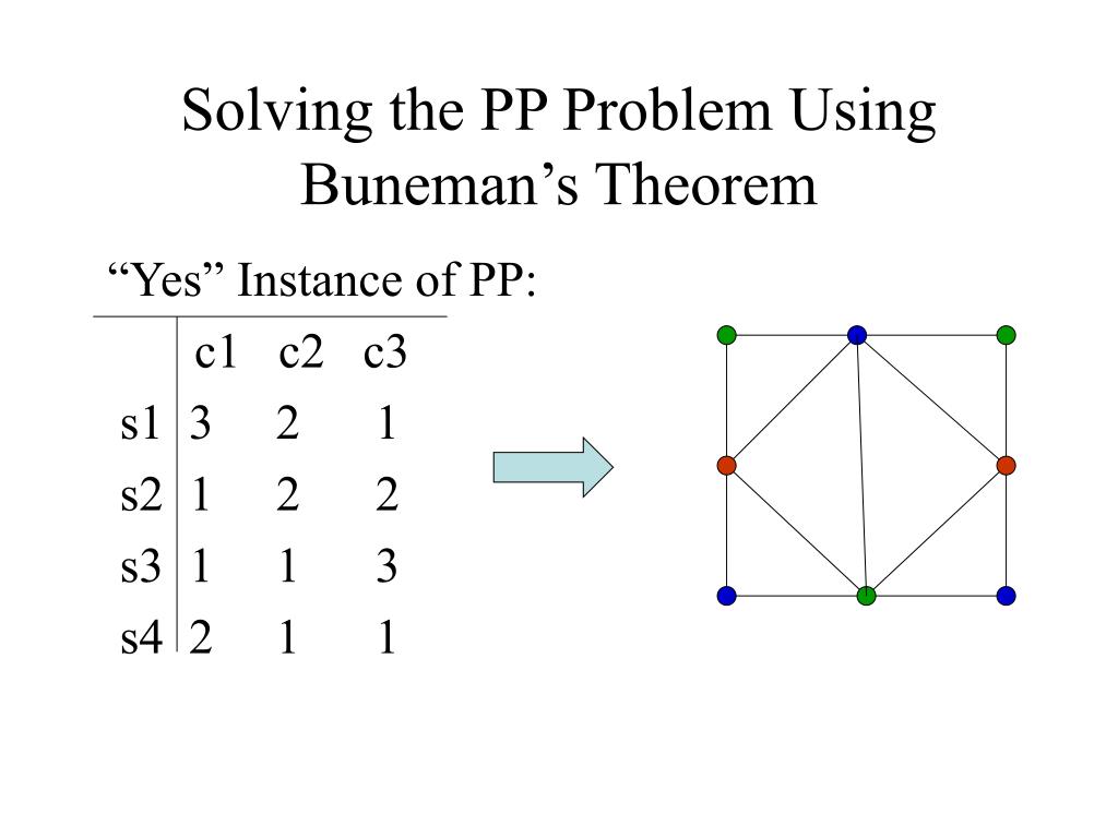 Solving the PP Problem Using Buneman’s Theorem “Yes” Instance of PP: c1 c2 c3 s1 3 2 1 s2 1 2 2 s3 1 1 3 s4 2 1 1