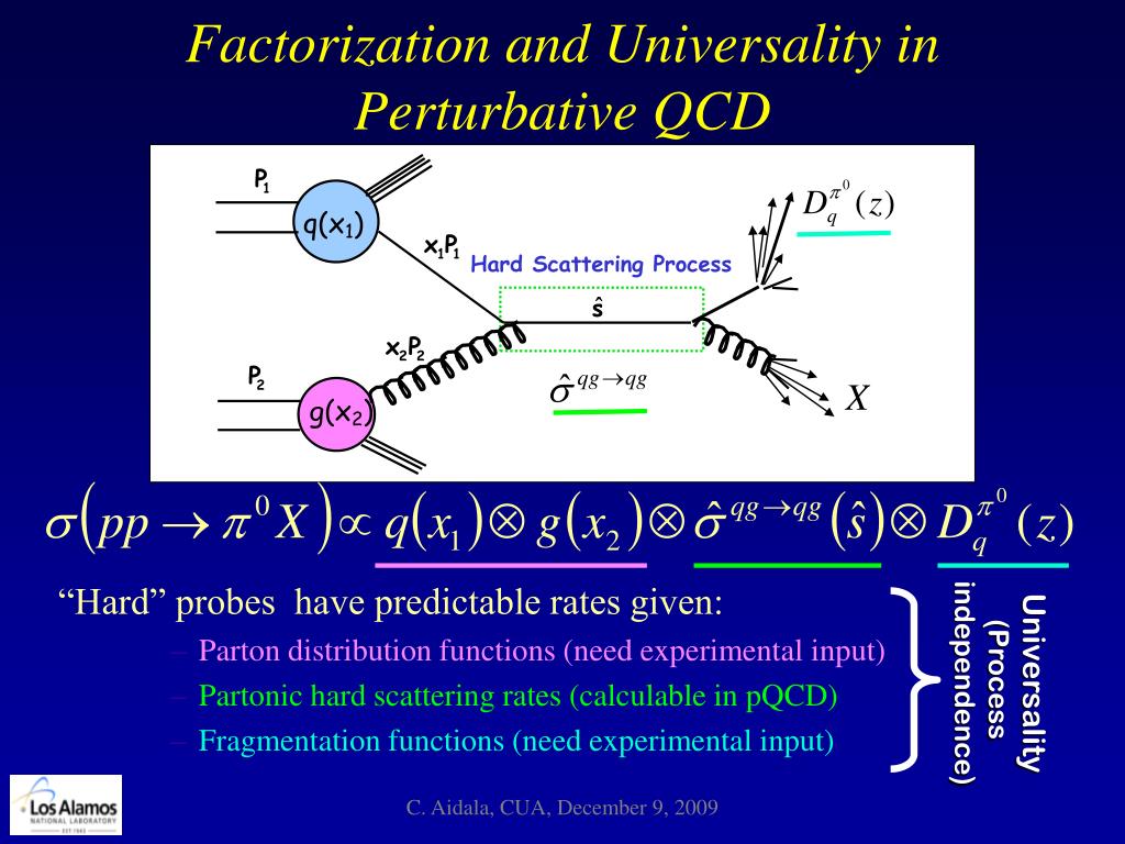 q(x1) Hard Scattering Process X g(x2) Universality (Process independence) Factorization and Universality in Perturbative QCD • “Hard” probes have predictable rates given: • Parton distribution functions (need experimentalinput) • Partonic hard scattering rates (calculable in pQCD) • Fragmentation functions (need experimental input) C. Aidala, CUA, December 9, 2009