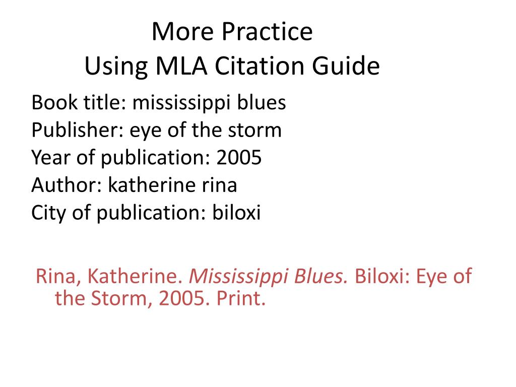 More Practice Using MLA Citation Guide Book title: mississippi blues Publisher: eye of the storm Year of publication: 2005 Author: katherinerina City of publication: biloxi Rina, Katherine. Mississippi Blues. Biloxi: Eye of the Storm, 2005. Print.