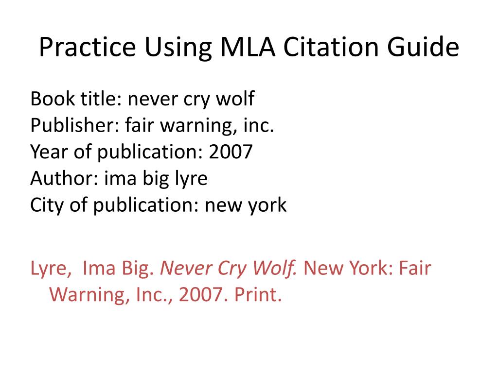 Practice Using MLA Citation Guide Book title: never cry wolf Publisher: fair warning, inc. Year of publication: 2007 Author: ima big lyre City of publication: new york Lyre, Ima Big. Never Cry Wolf. New York: Fair Warning, Inc., 2007. Print.