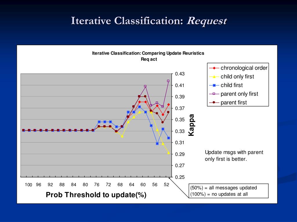 Collective/Iterative Classification 0.53 TIME • Start with baseline (BOW) • How to make updates? • Chronological order • Using “family-heuristics” (child first, parent first, etc) • Using posterior probability (Maximum Entropy learner) (Threshold, ranking, etc) 0.65 0.85 0.85 0.95 0.93