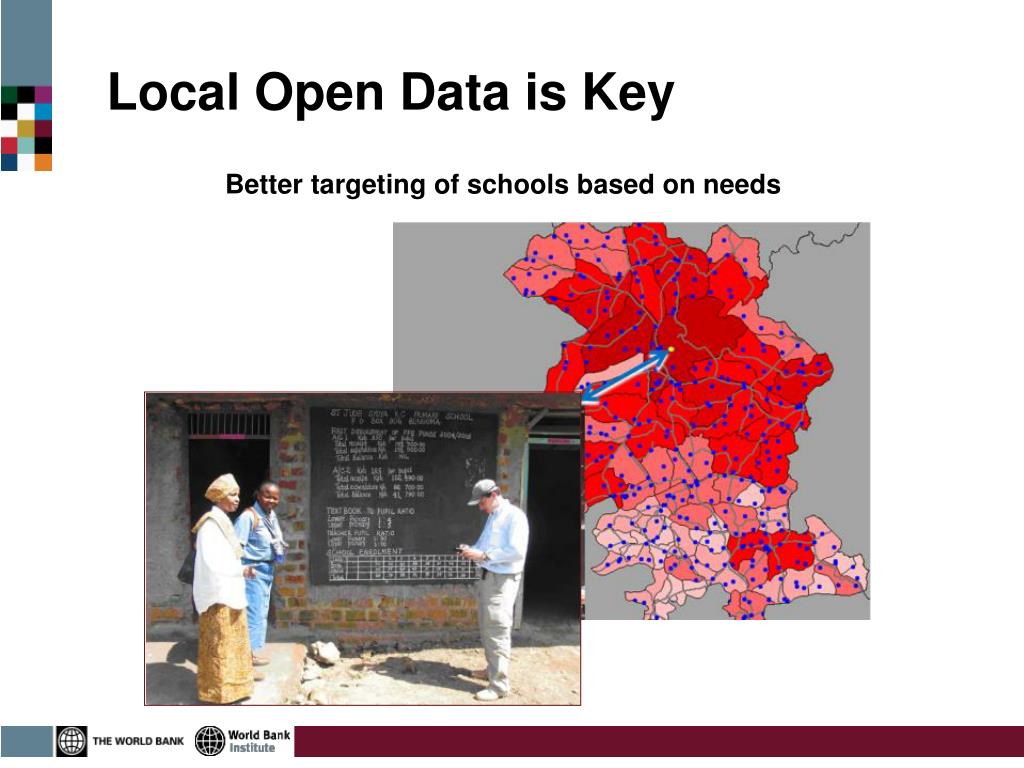 3) Citizen Feedback Loops • Build pilots to enable two-way information flows between citizens & governments • Citizen generated data, i.e. CheckMySchool.org