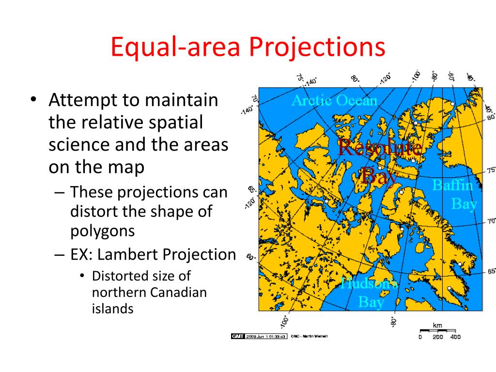 Equal-area Projections • Attempt to maintain the relative spatial science and the areas on the map • These projections can distort the shape of polygons • EX: Lambert Projection • Distorted size of northern Canadian islands