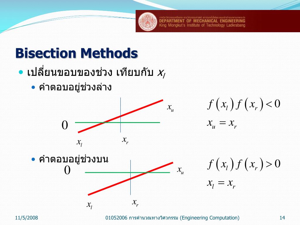 Bisection Methods • เปลี่ยนขอบของช่วง เทียบกับ xu • คำตอบอยู่ช่วงล่าง • คำตอบอยู่ช่วงบน 01052006 การคำนวณทางวิศวกรรม (Engineering Computation)