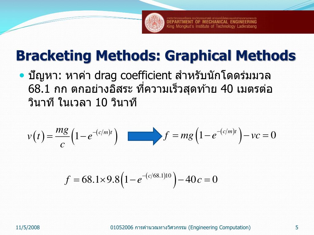 Bracketing Methods: Graphical Methods ปัญหา: หาค่า drag coefficient สำหรับนักโดดร่มมวล 68.1 กก ตกอย่างอิสระ ที่ความเร็วสุดท้าย 40 เมตรต่อวินาที ในเวลา 10 วินาที 01052006 การคำนวณทางวิศวกรรม (Engineering Computation)