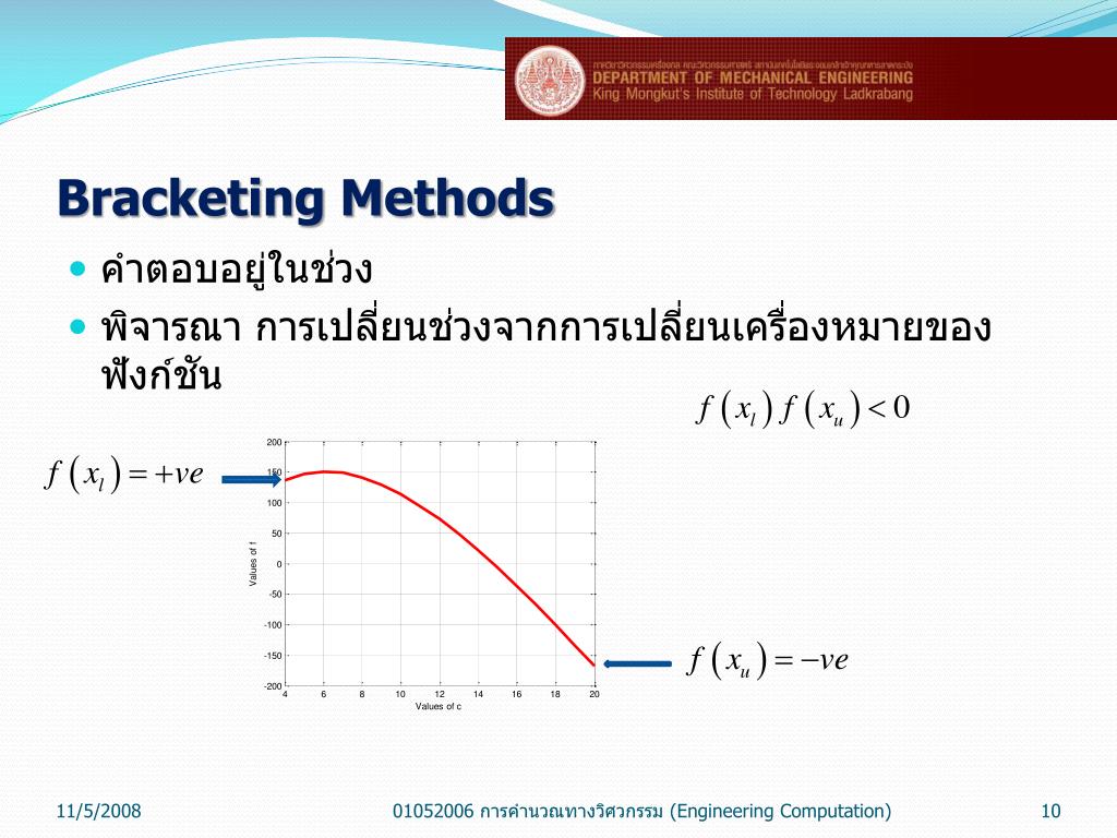 Bracketing Methods คำตอบอยู่ในช่วง พิจารณา การเปลี่ยนช่วงจากการเปลี่ยนเครื่องหมายของฟังก์ชัน 01052006 การคำนวณทางวิศวกรรม (Engineering Computation)