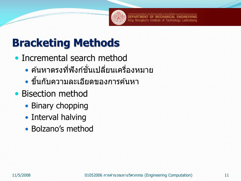 Bracketing Methods • Incremental search method • ค้นหาตรงที่ฟังก์ชั่นเปลี่ยนเครื่องหมาย • ขึ้นกับความละเอียดของการค้นหา • Bisection method • Binary chopping • Interval halving • Bolzano’s method 01052006 การคำนวณทางวิศวกรรม (Engineering Computation)