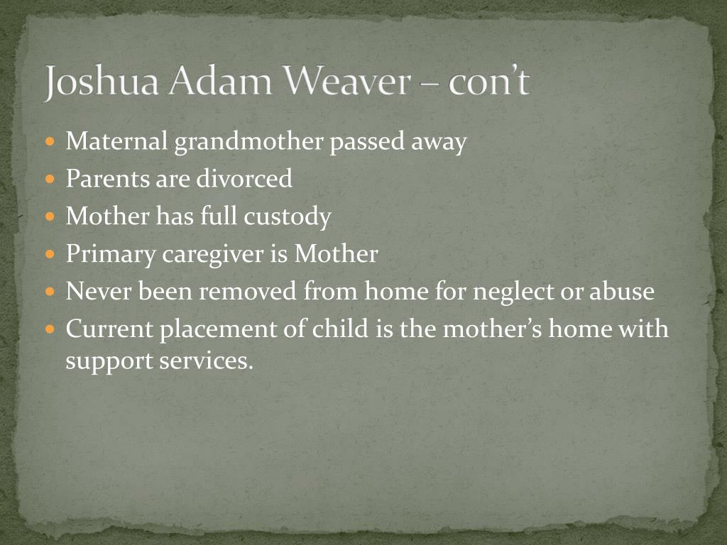 Joshua Adam Weaver – con’t • Maternal grandmother passed away • Parents are divorced • Mother has full custody • Primary caregiver is Mother • Never been removed from home for neglect or abuse • Current placement of child is the mother’s home with support services.
