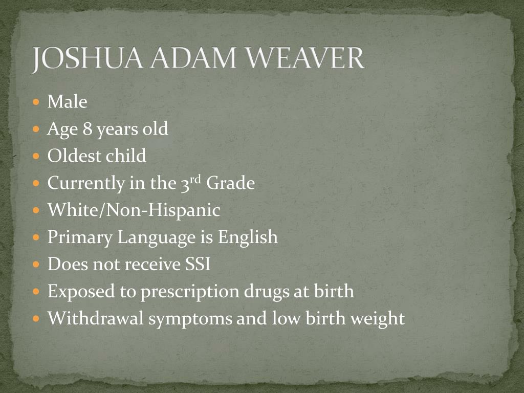 JOSHUA ADAM WEAVER • Male • Age 8 years old • Oldest child • Currently in the 3rd Grade • White/Non-Hispanic • Primary Language is English • Does not receive SSI • Exposed to prescription drugs at birth • Withdrawal symptoms and low birth weight