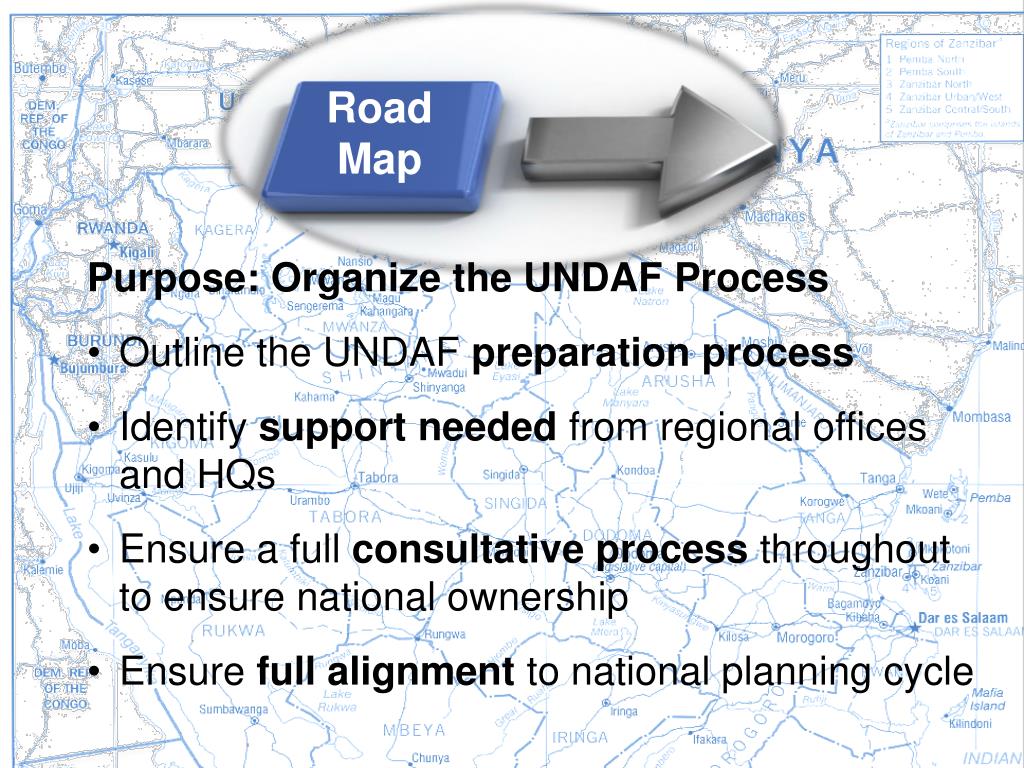 Road Map Road Map Purpose: Organize the UNDAF Process • Outline the UNDAF preparationprocess • Identify support needed from regional offices and HQs • Ensure a full consultative process throughout to ensure national ownership • Ensure full alignment to national planning cycle