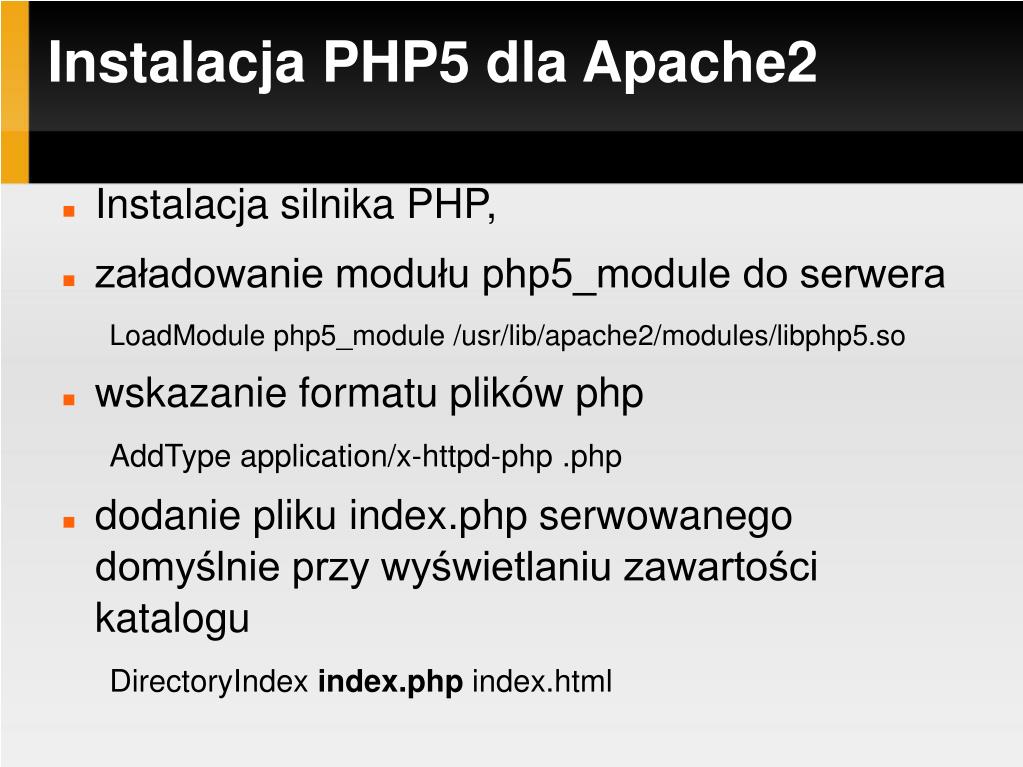 Instalacja PHP5 dla Apache2 • Instalacja silnika PHP, • załadowanie modułu php5_module do serwera LoadModule php5_module /usr/lib/apache2/modules/libphp5.so • wskazanie formatu plików php AddType application/x-httpd-php .php • dodanie pliku index.php serwowanego domyślnie przy wyświetlaniu zawartości katalogu DirectoryIndex index.php index.html