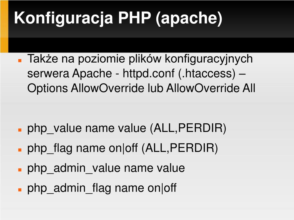Konfiguracja PHP (apache) • Także na poziomie plików konfiguracyjnych serwera Apache - httpd.conf (.htaccess) – Options AllowOverride lub AllowOverride All • php_value name value (ALL,PERDIR) • php_flag name on|off (ALL,PERDIR) • php_admin_value name value • php_admin_flag name on|off