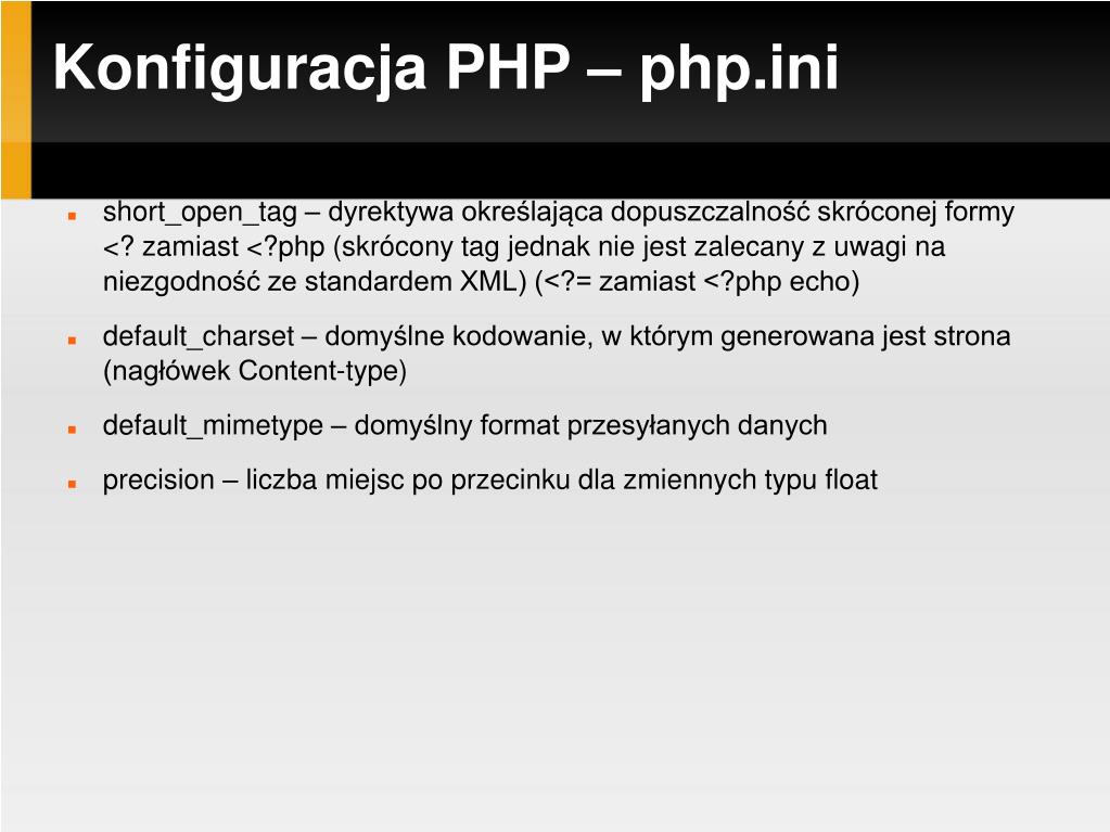 Konfiguracja PHP – php.ini • short_open_tag – dyrektywa określająca dopuszczalność skróconej formy <? zamiast <?php (skrócony tag jednak nie jest zalecany z uwagi na niezgodność ze standardem XML) (<?= zamiast <?php echo) • default_charset – domyślne kodowanie, w którym generowana jest strona (nagłówek Content-type) • default_mimetype – domyślny format przesyłanych danych • precision – liczba miejsc po przecinku dla zmiennych typu float