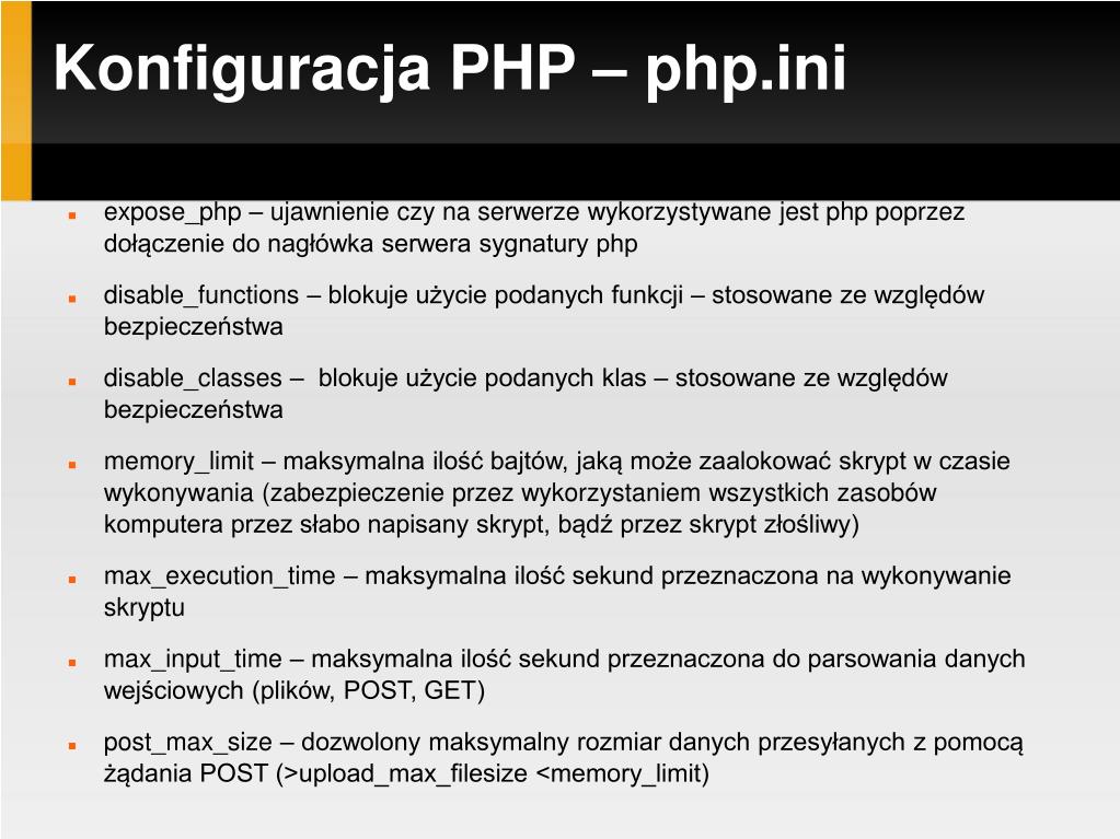 Konfiguracja PHP – php.ini • expose_php – ujawnienie czy na serwerze wykorzystywane jest php poprzez dołączenie do nagłówka serwera sygnatury php • disable_functions – blokuje użycie podanych funkcji – stosowane ze względów bezpieczeństwa • disable_classes – blokuje użycie podanych klas – stosowane ze względów bezpieczeństwa • memory_limit – maksymalna ilość bajtów, jaką może zaalokować skrypt w czasie wykonywania (zabezpieczenie przez wykorzystaniem wszystkich zasobów komputera przez słabo napisany skrypt, bądź przez skrypt złośliwy) • max_execution_time – maksymalna ilość sekund przeznaczona na wykonywanie skryptu • max_input_time – maksymalna ilość sekund przeznaczona do parsowania danych wejściowych (plików, POST, GET) • post_max_size – dozwolony maksymalny rozmiar danych przesyłanych z pomocą żądania POST (>upload_max_filesize <memory_limit)