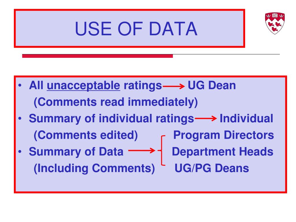 USE OF DATA • All unacceptable ratings UG Dean (Comments read immediately) • Summary of individual ratings Individual (Comments edited) Program Directors • Summary of Data Department Heads (Including Comments) UG/PG Deans