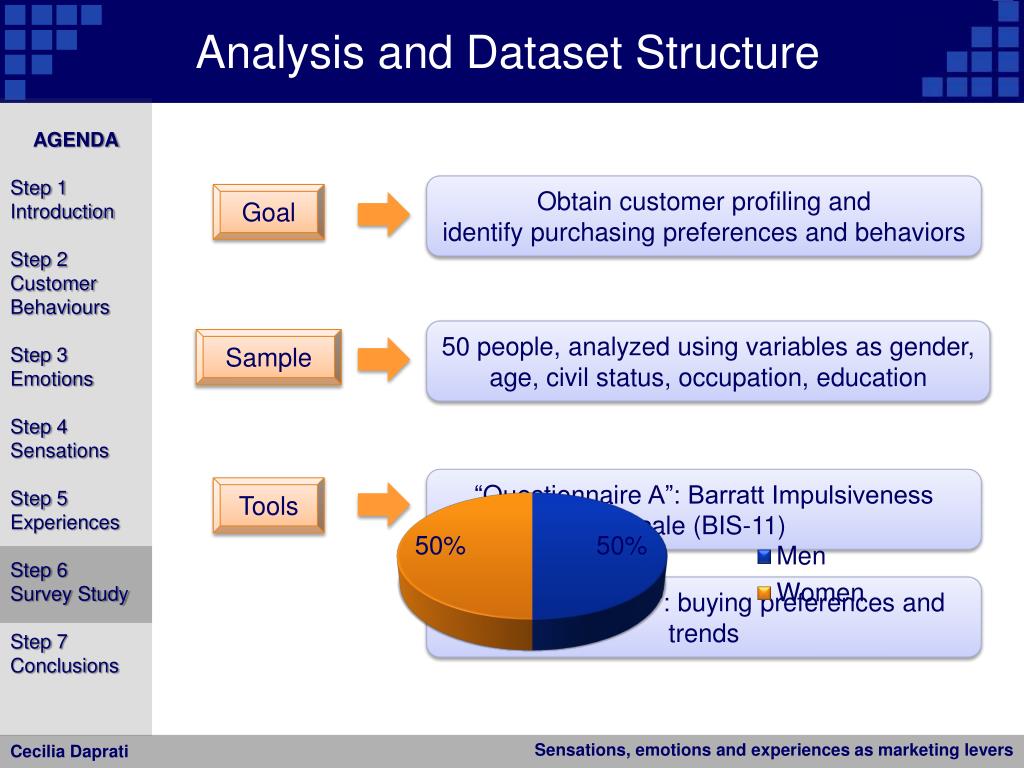 Analysis and Dataset Structure AGENDA Step 1 Introduction Step 2 Customer Behaviours Step 3 Emotions Step 4 Sensations Step 5 Experiences Step 6 SurveyStudy Step 7 Conclusions Obtain customer profiling and identify purchasingpreferences and behaviors Goal 50 people, analyzed usingvariables as gender, age, civil status, occupation, education Sample “Questionnaire A”: Barratt Impulsiveness Scale (BIS-11) Tools “Questionnaire B”: buyingpreferences and trends Cecilia Daprati Sensations, emotions and experiences as marketing levers