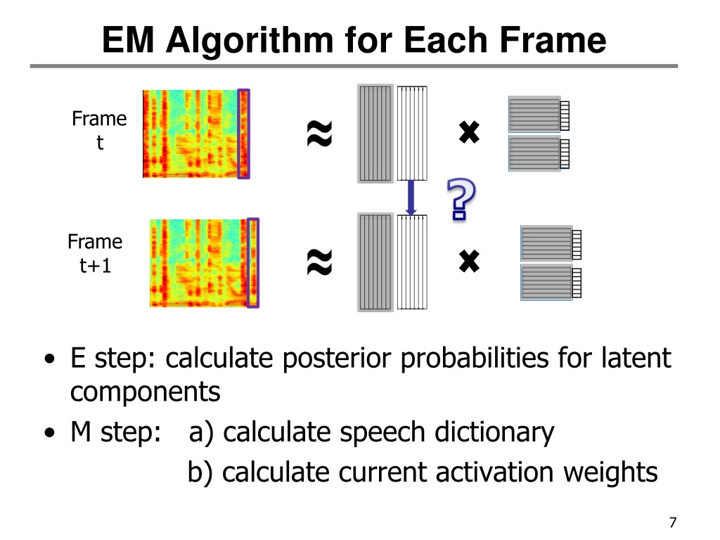 EM Algorithm for Each Frame • E step: calculate posterior probabilities for latent components • M step: a) calculate speech dictionary b) calculate current activation weights Frame t ? Frame t+1