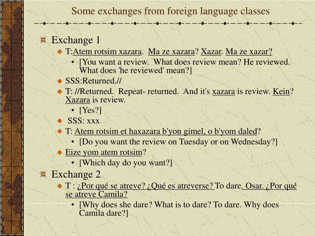 Some exchanges from foreign language classes • Exchange 1 • T:Atem rotsim xazara. Ma ze xazara? Xazar. Ma ze xazar? • [You want a review. What does review mean? He reviewed. What does 'he reviewed' mean?] • SSS:Returned.// • T: //Returned. Repeat‑ returned. And it's xazara is review. Kein? Xazara is review. • [Yes?] • SSS: xxx • T: Atem rotsim et haxazara b'yon gimel, o b'yom daled? • [Do you want the review on Tuesday or on Wednesday?] • Eize yom atem rotsim? • [Which day do you want?] • Exchange 2 • T : ¿Por qué se atreve? ¿Qué es atreverse? To dare. Osar. ¿Por qué se atreve Camila? • [Why does she dare? What is to dare? To dare. Why does Camila dare?]